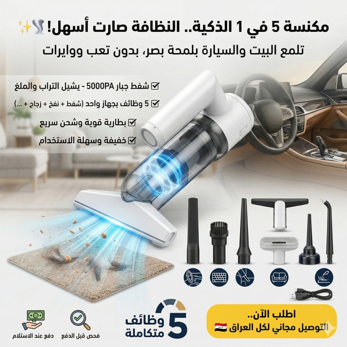 مكنسة 5 في 1 الذكية – تنظيف قوي لكل مكان بدون تعب!